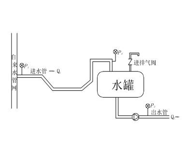 進(jìn)水管從水罐上部注水入罐。罐頂裝有一個(gè)注排氣閥,它具有在滿水時(shí)關(guān)閉,在罐內(nèi)產(chǎn)生負(fù)壓或水位下降時(shí)打開閥門補(bǔ)入大氣的作用,所以也被稱為“真空消除器”“真空補(bǔ)償器”等。該類裝置有浮子、浮球等機(jī)械式、有靠電接點(diǎn)真空表或水罐水位接點(diǎn)控制電磁閥啟閉的電動(dòng)式等方式各異,名稱標(biāo)新的很多品類。在水罐注滿水時(shí)此閥閉緊,此時(shí)水罐為承壓的密閉容器,可視為管路上增加了一個(gè)有突然放大和突然縮小局部阻力損失的異徑管。罐底連接至水泵進(jìn)水口,并建立了水泵出水口的靜水頭。