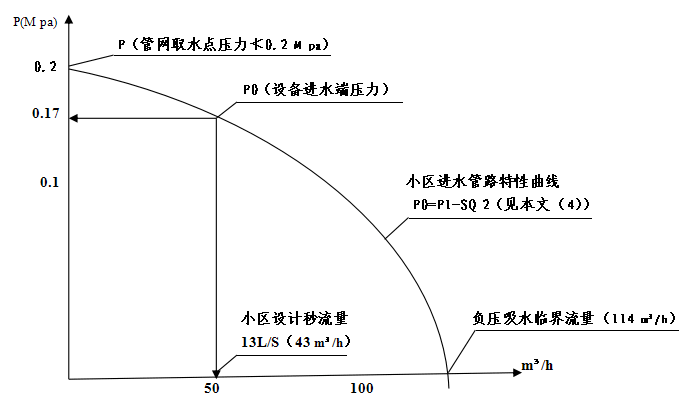 依計(jì)算公式(1)、(2)可以算出該小區(qū)進(jìn)水管路的自由出水流量,即管路向開口容器(水池)送水的流量Q=114m3/h。如果在出水管端連接水泵抽水,此流量Q就是應(yīng)限制的負(fù)壓抽水的臨界點(diǎn),只要可控制水泵的出水流量小于限制流量Q,則不會(huì)出現(xiàn)負(fù)壓吸水現(xiàn)象。應(yīng)該指出,水泵直接管網(wǎng)增壓時(shí)所增補(bǔ)揚(yáng)程的高、低對(duì)管網(wǎng)的壓力降無(wú)任何影響,唯有取水流量是影響管網(wǎng)壓力的因素。例如:500戶低層住宅用水量和經(jīng)過(guò)水泵加壓后送至數(shù)十米高層住宅500戶時(shí)的用水量是相同的,水泵增壓而不增流量,自然不會(huì)因?yàn)樵鰤憾绊懝芫W(wǎng)壓力安定。所以,只要可以控制住水泵在任何工況下都不會(huì)超過(guò)限量抽水,即:只需要將“水泵應(yīng)在管網(wǎng)限定流量下運(yùn)轉(zhuǎn)不得超量取水”列為管網(wǎng)直接加壓供水設(shè)備的準(zhǔn)用條件就可無(wú)能力不足之慮了。